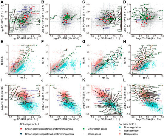 Expression patterns of photomorphogenesis-related transcripts at different time points: (A–D) Scatterplots of the fold-changes in RNA or RPF abundance following various durations of light exposure: (A), 0–0.5 h; (B), 0.5–1 h; (C), 1–2 h; (D), 2–4 h. All values are log2-normalized fold-changes between the listed time points. (E–H) Scatterplots of the translation efficiency (TE) following various durations of light exposure: (E), 0–0.5 h; (F), 0.5–1 h; (G), 1–2 h; (H), 2–4 h. (I–L) Scatterplots of log2-normalized fold-changes in TE or RPF abundance following various durations of light exposure: (I), 0–0.5 h; (J), 0.5–1 h; (K), 1–2 h; (L), 2–4 h. Positive and negative regulators of photomorphogenesis are indicated with red and blue triangles, respectively. Chloroplast transcripts are indicated in green rectangles. Upregulated, downregulated, and unchanged transcripts are marked with pink, cyan, and gray dots, respectively.