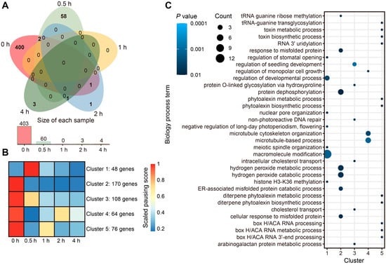 Genome-wide light-responsive ribosome-pausing events in maize-etiolated seedlings: (A) Venn diagram showing the extent of overlap between significant ribosome-pausing events identified at each of the time points of illumination. The numbers indicate pausing events specific to each sample or common to different samples. (B) Clustering analysis of transcripts showing ribosome-pausing events defining five clusters. The color scale indicates the strength of ribosome pausing. (C) Gene ontology (GO) term enrichment analysis (biology processes) of the genes whose transcripts belong to one of the five clusters defined above. The size of the circles indicates the number of genes; the color indicates the P value.