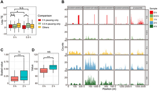 Based on reports from bacteria, yeast, Arabidopsis, and cancer cells, paused ribosomes negatively regulate protein biosynthesis [36,37,38,39]. To examine the effects of ribosome pausing on plant translation, we characterized the TE changes for the genes from each of the five clusters in the 0–0.5 h pairwise comparison (Figure S3C). Notably, most of these paused transcripts did not show significant changes in their TE for this time interval. In Cluster 1, the TE of 15 and 2 transcripts was significantly upregulated and downregulated, respectively. In Clusters 2–5, very few transcripts exhibited an increased TE, with relatively more transcripts experiencing a decrease in their TE during the 0–0.5 h interval.