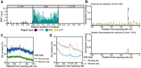 In chloroplasts, the secondary structure of mRNA, contiguous proline residues in the encoded proteins, and positive charges carried by newly formed peptides are all associated with ribosome pausing [18]. In the study of bacteria, several factors affected the movement speed of ribosomes, such as Shine–Dalgarno sequences, pro-pro motifs, and charged amino acids mediating specific interactions between the ribosomal exit tunnel and the nascent peptide [37,40,41,42]. To investigate the sequence features linked to ribosome pausing in maize, we analyzed the encoded amino acids around the pausing sites, the charges of their nascent peptide chains, and the sequence conservation of the transcripts. We did not identify clear pro-pro motif characteristics in the nascent peptide sequences around the pausing sites or a clear pattern in their charge properties (Figure S9). We thus looked for a sequence feature in the transcripts undergoing ribosome pausing. Importantly, we detected a clear C signal at 13 nt upstream of the pause sites (Figure 6B). This signal should not be caused by RNase I digestion, as RNase I has no base preference [43]. We also checked the sequences of random RPFs on transcripts without ribosome pausing and failed to find this C-rich motif, suggesting that the upstream C-rich feature is specific for transcripts subjected to ribosome pausing (Figure 6B). In addition, we compared the GC content between pausing and non-pausing transcripts using 500 bp of sequences on either side of the pausing sites or of random sites from non-pausing RPFs. The GC ratio around the pausing site was higher than that of other ribosome-protected sites not undergoing pausing (Figure 6C).