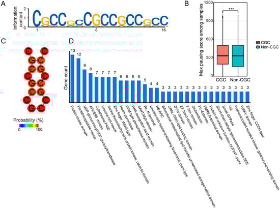 (A) A repeated CGC motif appears in the region downstream of ribosome-pausing sites. The height of each letter indicates the probability at the corresponding position. The positions along the x-axis are the length of the motif. (B) Maximum ribosome-pausing scores between transcripts with or without CGC motifs in all ribosome-paused transcripts. Significant mark *** for p value < 0.001. (C) Predicted secondary structure of the CGC motif. The possibilities of base-pairing are indicated as a gradient from blue (0%) to red (100%). (D) GO term enrichment analysis of genes whose transcripts contain the CGC motif.