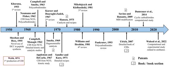 Besides these applications, the interest of the scientific community in CDIs research dates back to 1874, when W. Weith, a German chemist, discovered carbodiimides by dehydrating thioureas []. The first review of CDIs published 70 years ago was followed by numerous books, reviews, and patents resulting in a more and more detailed and deeper understanding of the subject [] (Figure 1).