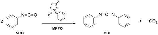 The overall reaction of the formation of diphenylcarbodiimide (CDI) using phenyl isocyanate (NCO) and 3-methyl-1-phenyl-2-phospholene-l-oxide (MPPO) catalyst.