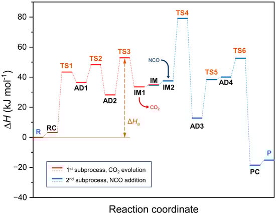 The starting point is the reactant reagents complex of NCO + MPPO, which is defined as 0.0 kJ mol−1 as a reference. The process begins with the first subprocess, with the formation of the RC, which is slightly higher in enthalpy (3.2 kJ mol−1; Table 1 and Figure 3), which is attributed to the structural similarities. The first transition state (TS1) is formed with a moderately high relative enthalpy (43.4 kJ mol−1), followed by the formation of a stable AD1 complex in the next step. Subsequently, via a moderate TS2 (48.3 kJ mol−1), the AD2 complex lowers the enthalpy level to −28.2 kJ mol−1. Through the second highest enthalpy TS3 (52.9 kJ mol−1), the IM1 complex is formed when CO2 is eliminated from the structure. Interestingly, from an enthalpy point of view, a less stable IM is formed compared to IM1 and IM2; however, the leaving of the CO2 provides a high entropy release and makes the formation of the IM irreversible. To keep appropriate relative energies, the presented IM enthalpy is given by the sum of calculated IMs and the leaving CO2 energy, with the difference in initial reactants. Similarly, IM2 is formed by subtracting the entering NCO’s energy, which is already presented in the complex. IM2 is pursued by the highest energy barrier toward TS4 (ΔH = 79.1 kJ mol−1). In the literature, this high energy barrier was explained by the low reactivity of the phosphine imide (IM), resulting in a slow reaction with the NCO [], which agrees well with our calculations. In the second subprocess, analogously to the previous steps, the enthalpy barrier is followed by a deep valley of AD3, with a relative enthalpy of 12.5 kJ mol−1, leading to the AD4 complex (Figure 3) via TS4. In the next step, TS5 (52.7 kJ mol−1) is developed towards the final and most stable complex of PC (−19.0 kJ mol−1; Table 1). Finally, the P, product, includes the relative energy of CDI + MPPO. Nonetheless, the sum energy of products remains negative, which declares an exothermic process of ΔrH = −15.1 kJ mol−1 reaction enthalpy, and the negative Gibbs free energy (ΔrG = −6.7 kJ mol−1) also demonstrates a thermodynamically spontaneous, one-way catalytic reaction (Table 1, Figure S3).