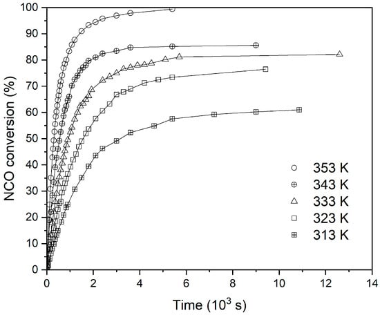 Reactions were carried out at five different temperatures between 313 and 353 K, with the measurement time range varying between 12,600 s and 5400 s, respectively. It should be noted here that the calculated NCO conversion is directly related to carbodiimide (CDI) formation, and no formation of side products was taken into consideration. The NCO conversion versus time data (Figure 4) reveal that in each case the plots run into saturation, i.e., equilibrium is reached. It is evident from Figure 4 that the reaction has a significant temperature dependence. At 353 K, almost 100% conversion is reached within 4800 s, while at 313 K, the conversion is approximately 55% even after 11,000 s. It can also be seen that NCO conversion is directly proportional to temperature: the higher the temperature, the higher the conversion (observed independently at all time values).