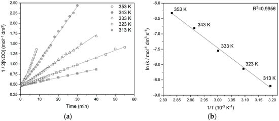 Second-order kinetics was applied to describe the process since the reaction fits the 2A → product + byproduct model, i.e., it proceeds through the reaction of two NCO molecules. The differential Equation (1) and integrated rate Equation (2) are shown below, where [NCO] is the actual isocyanate concentration at time t in mol dm−3, t is the time in seconds, k is the rate constant in mol−1 dm3 s−1, and [NCO]0 is the initial concentration of isocyanate in mol dm−3.