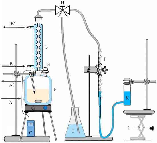 The experimental apparatus. A,B,A′,B′—thermostats; C—thermometer; D—reflux condenser; E—inlets for NCO and nitrogen input; F—reaction vessel; G—magnetic stirrer; H—3-way stopcock; I—atmospheric equilibrium flask; J—gas burette; K—level vessel; L—laboratory scissor jack.