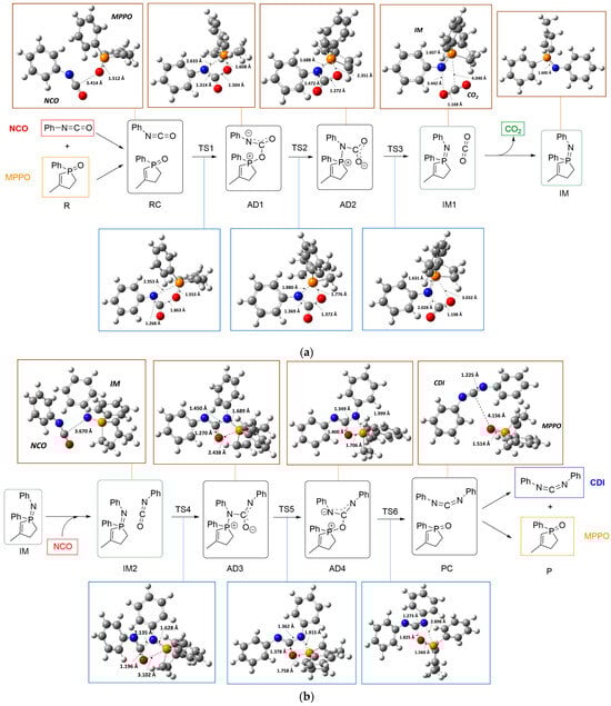Although reaction mechanisms for the formation of diphenylcarbodiimide (CDI) from phenyl isocyanate (NCO) have already been proposed in the literature [,], they are flawed and fail to explain the whole process in detail. Here, we present a more detailed catalyzed mechanism, calculated by the B3LYP/6-31G(d)[SMD(ODCB)] level of theory, which can be split into two subprocesses and is summarized in Scheme 1a,b, Table S1 and Table 1. In the first subprocess (Scheme 1a), the NCO attacks the MPPO catalyst, releasing CO2 and forming phosphine imide (IM). Scheme 1b shows the second subprocess of an additional NCO attack and the final formation of the product CDI as well the catalyst recovery of the MPPO catalyst. The structures of the possible intermediates (IMs), adducts (ADs), complexes (RC, PC), and transition states (TSs) were calculated.