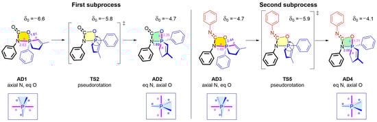 The pseudorotation in the first (AD1 → TS2 → AD2) and second subprocesses (AD3 → TS5 → AD4) and the calculated NICS values (δ0 in ppm, this value is −9.6 ppm for benzene ring), which refer to the slightly aromatic character of the P–O–C–N rings. Purple bond lengths and the same colored ‘a’ refer to the axial groups, while blue bonds and black colored ‘e’ refer to the equatorial groups.