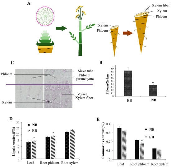 Physiological changes during early bolting of ADF. (A) Development of flowering and bolting. (B) Root phloem/xylem ratio of early-bolting and normal plants. (C) The right panel shows early-bolting plants, and the left panel shows normal plants. (D) Lignin content of early-bolting and normal plants. (E) Coumarin content of early-bolting and normal plants. EB, early-bolting ADF; NB, non-bolting ADF. * Indicates extremely significant difference (p < 0.05); ** indicates extremely significant difference (p < 0.01).