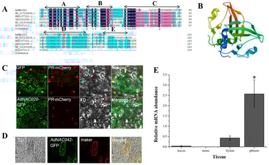 Sequence analysis of AdNAC20. (A) Homology analysis of the protein encoded by the AdNAC20 gene. (B) Protein structure predicted by SWISS-MODEL homologous modeling. (C) Subcellular localization analysis of AdNAC20 in N. benthamiana. (D) Subcellular localization analysis of AdNAC20 in ADF leaves. (E) Tissue expression analysis of AdNAC20. GFP, blank control; PR mCherry, nuclear localization marker; TD, bright; merged, combination map; marker, nuclear and cytomembrane localization marker. * Indicates extremely significant difference (p < 0.05).