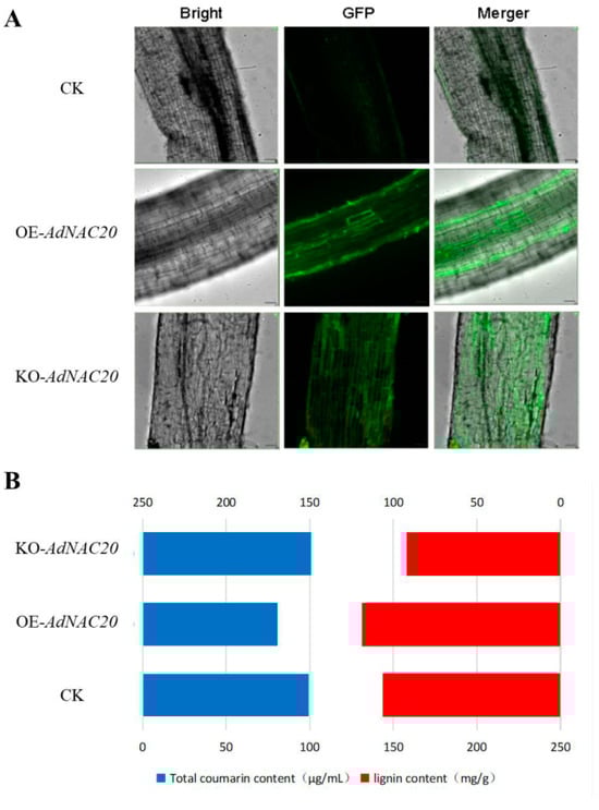 The AdNAC20 gene was transiently expressed in the roots of ADF using 35S::AdNAC20 and AdNAC20-Cpf1 Agrobacterium infiltration methods to verify its biological function (Figure 3A). The infiltrated roots displayed strong fluorescence, indicating that the AdNAC20 gene was successfully expressed. The cross-sections of the infiltrated roots were subjected to specific phloroglucinol staining, which revealed that the degree of root lignification decreased in the following order: OE-NAC20 > CK > KO-NAC20 (Figure 3). Compared with that of the non-infiltrated control, the lignin content of OE-NAC20 significantly increased by 11.80%, and the coumarin content significantly decreased by 18.65%. In contrast, compared with that of the control, the lignin content of KO-NAC20 significantly decreased by 13.28%, and the coumarin content increased by 1.49% (Figure 3B). Transient expression of AdNAC20-GFP revealed that AdNAC20 was involved in lignin and coumarin biosynthesis in ADF roots.