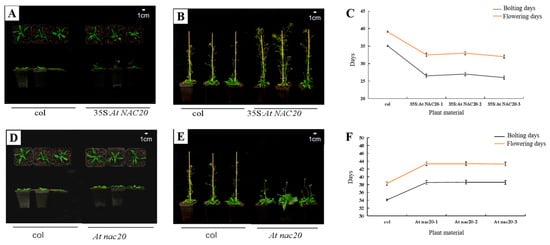 The 35S::AdNAC20 and AdNAC20-Cpf1 constructs were individually transformed into the E. coli strain DH5α via a freeze–thaw method. After sequence confirmation, the fusion constructs 35S::AdNAC20 and AdNAC20-Cpf1 were introduced into A. tumefaciens strain GV3101. The protein encoded by this gene AT5G50820.1 of A.thaliana was highly homologous to AdNAC20. Then, mutant seeds of AT5G50820.1, an AdNAC20 mutant line of A. thaliana (At nac20), were purchased from AraShare for PCR validation. Primers were designed according to the T-DNA Primer Design website (http://signal.salk.edu/tdnaprimers.2.html (accessed on 13 May 2021)). Agrobacterium suspensions were used for steady transformation via the floral-dip method to obtain the overexpression lines (35S:NAC20) and reverse-complemented lines (RC At NAC20) of A. thaliana plants []. T3 homozygous lines of A. thaliana were used for phenotypic investigation. The verified pCAMBIA3301-NAC20-GV3101 and AdNAC20-Cpf1-GV3101 Agrobacterium suspensions were steadily transformed into ADF plants via the same floral-dip method [].
