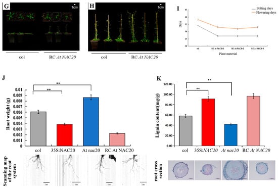 Expression of AdNAC20 in A. thaliana and its phenotype. (A) A. thaliana plants overexpressing AdNAC20 at the early-flowering stage on day 33. (B) Phenotypes of A. thaliana plants overexpressing AdNAC20 at the late-flowering stage of 44 days. (C) Statistics of flowering days for bolting A. thaliana plants overexpressing AdNAC20. (D) The early-flowering phenotype of A. thaliana plants with AdNAC20 deletion on day 33. (E) Phenotypes of A. thaliana plants with AdNAC20 deletion at the late-flowering stage of 44 days. (F) Statistics of flowering days for bolting A. thaliana plants with the AdNAC20 gene deletion mutant. (G) The AdNAC20 deletion mutant supplemented the early-flowering phenotype of A. thaliana at 33 days. (H) The phenotype of A. thaliana plants at the late-flowering stage 44 days after AdNAC20 deletion. (I) Statistics on flowering days of bolting A. thaliana plants supplemented with the AdNAC20 gene deletion mutant. (J) Root weight statistics and root scanning of A. thaliana seedlings after 60 days. (** indicates highly significant differences.) (K) Observation of lignin content in A. thaliana after 60 days of seeding and root cross-cut saffron–solid green staining. Red indicates lignified cell tissue. Green indicates cellulose cell tissue. 35S:AdNAC20, AdNAC20 overexpression lines of A. thaliana plants; RC AdNAC20, AdNAC20 reverse-complemented lines of A. thaliana plants; At nac20, AdNAC20 mutant lines of A. thaliana plants; col, wild-type of A. thaliana plants (Col-0). (** indicates highly significant differences.)