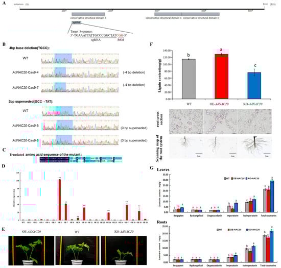 Identification of AdNAC20 ADF mutant plants via CRISPR/Cas9 mutagenesis. (A) Selection of sgRNAs for gene editing of AdNAC20. The gray boxes represent conserved structural domains; the straight lines extending out the region are the sgRNAs, and the red letters indicate the CGGs in the PAM sequence. (B) DNA identification of AdNAC20 mutants in ADF. (C) Translated amino acid sequence of the mutant. (D) Expression of the AdNAC20 gene in plants overexpressing this gene. (E) Phenotypes of the AdNAC20-modified lines. (G) Coumarin content in the roots and leaves of gene-edited ADF and the control. (F) Effective lignin extraction in the AdNAC20-modified lines. Section observation of root lignin phloroglucinol staining of ADF roots. Phloroglucinol redifies lignin, and the darker the color is, the greater the degree of lignification. OE-NAC20, AdNAC20-overexpressing plants of ADF; KO-NAC20, AdNAC20 mutant plants of ADF; WT, wild-type plants of ADF. (** indicates highly significant differences.)