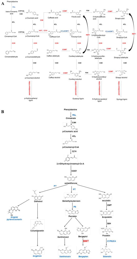 The effective components of ADF are mainly coumarins, especially furocoumarins, such as imperatorin, isoimperatorin, hydrated and oxidated imperatorin, byakangclicol, angelicin, etc. [,]. Coumarins are located mainly in the oil tubes of the root phloem []. Phenylpropanoids, including lignin, lignans, and coumarins, contribute to all aspects of plant responses to biotic and abiotic stimuli [,]. Phenylalanine is catalyzed by phenylalanine ammonia lyase (PAL), cinnamate-4 hydroxylase (C4H), and 4-coumaryl-CoA ligase (4CL) to produce cinnamic acid, p-hydroxycoumaric acid (pCA), and coumaryl-CoA in most plants. The initial three steps of the phenylpropanoid biosynthesis pathway are mandatory and provide the basis for the resulting lignin, coumarin, and other phenylpropanoids [,]. CCoAOMT not only participates in lignin biosynthesis but also leads to a reduction in the coumarin scopoletin in Arabidopsis thaliana (A. thaliana) roots [,]. According to comparative transcriptomics coupled with coexpression-associated analysis of P. praeruptorum, coumarin biosynthetic genes include PAL, C4H1, C3H, HCT, COMT, CCoAOMT, AS, PS1, BMTs, PRXs, and three peroxidases involved in lignin biosynthesis [,]. These genes are downregulated during bolting and ultimately reduce the formation of coumarins [,]. The overexpression of AaCAD in Artemisia annua enhances lignin and coumarin formation but decreases the levels of artemisinin, artemisinin B, and other sesquiterpenes [].