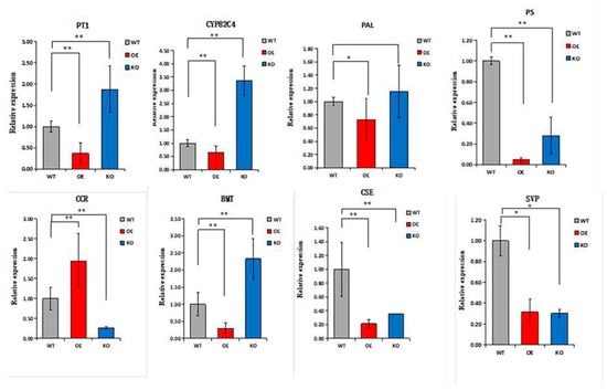 Expression levels of related genes in ADF xylem. * Indicates a significant difference, and ** indicates an extremely significant difference. OE, AdNAC20-overexpressing plants of ADF; KO, AdNAC20 mutant plants of ADF; WT, wild-type plants of ADF; PAL, phenylalanine ammonia-lyase; PT, prenyltransferase; PS, psoralen synthase; CCR, cinnamoyl-CoA reductase; BMT, bergaptol O-methyltransferase; CSE, caffeoylshikimate esterase; CYP82C4, 5-hydroxy-8-methoxypsoralen; SVP, short vegetative phase.