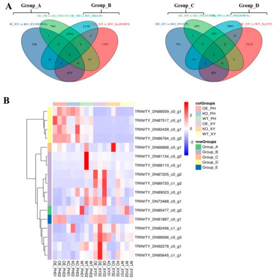 DEGs with opposite expression patterns in the xylem and phloem of AdNAC20 transgenic plants analyzed via a Venn diagram. (A) DEGs of 16 genes divided into four groups, Groups A~D. (B) Heatmap of DEGs of the four groups and AdNAC20 as Group E. OE_PH, root phloem of AdNAC20-overexpressing plants of ADF; KO_PH, root phloem of AdNAC20 mutant plants of ADF; WY_PH, root phloem of wild−type plants of ADF; OE_XY, root xylem of AdNAC20-overexpressing plants of ADF; KO_XY, root xylem of AdNAC20 mutant plants of ADF; WY_XY, root xylem of wild-type plants of ADF.