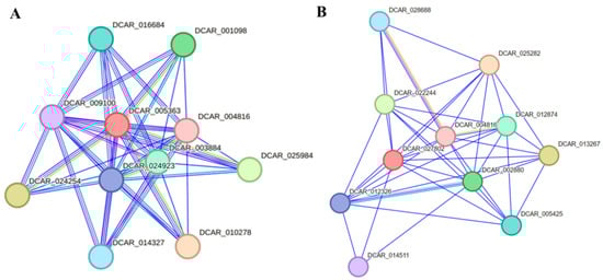 Protein–protein interactions of proteins predicted using STRING 12.0 software based on the Daucus carota L. var. sativa protein database. (A) Interaction network of DCAR 005363, a homologous protein of AdNAC20. (B) Interaction network of DCAR_027802, a homologous protein of TRINITY_DN89720_c1_g2 (NAC7-like).