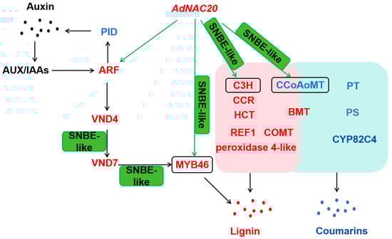Schematic diagram of the gene network interacting with AdNAC20 during early-bolting of ADF. AdNAC20 may be involved in the transcriptional network of lignin biosynthesis controlled by auxin and may also regulate lignin and coumarin biosynthesis via the phenylpropanoid pathway. SNBE-like indicates that a gene regulates the expression of the next gene by recognizing this motif in the promoter. Green arrows represent the predicted direct transcriptional regulation of AdNAC20 in this study. Red font represents upregulated genes. The blue font represents downregulated genes. The pink background represents the lignin biosynthesis pathway. The blue background represents the coumarin biosynthetic pathway. AUX, auxin response factors; IAAs, indole-3-acetic acid induced proteins; VND4, vascular-related NAC domain protein 6; VND7, vascular-related NAC domain protein 7; PID, protein kinase PINOID 2-like; ARF, auxin response factor; PAL, phenylalanine ammonia-lyase; CYP73A, trans-cinnamate 4-monooxygenase; C4H, cinnamate-4-hydroxylase; 4CL, 4-coumarate--CoA ligase; CSE, caffeoylshikimate esterase; C3H, coumarale-3-hydroxylase; COMT, caffeic acid 3-O-methyltransferase; CCoAOMT1, caffeoyl-CoA 5-O-methyltransfenase; CAD, cinnamyl-alcohol dehydrogenase; CCR, cinnamoyl-CoA reductase; REF1, coniferyl-aldehyde dehydrogenase; F5H, ferulate-5-hydroxylase; PT, prenyltransferase; PS, psoralen synthase; BMT, bergaptol O-methyltransferase; OMT, O-methyl-transferase; CYP82C4, 5-hydroxy-8-methoxypsoralen; C2H, coumarale-2-hydroxylase; COSY, coumarin synthase; S8H, scopoletin 8-hydroxylase; HCT, shikimate O-hydroxycinnamoyltransferase. (Red font indicates up-regulation of expression, blue font indicates down-regulation of expression.)