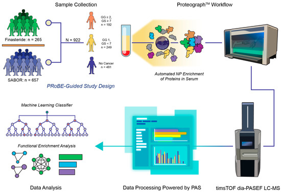 Study schematic. Design of the study was rooted in the principles of biomarker discovery as described by PRoBE (prospective specimen collection, retrospective blinded evaluation). Subjects were included from two different cohorts for prostate cancer, Finasteride and San Antonio Center of Biomarkers for Risk for Prostate Cancer (SABOR), where serum was collected according to the Early Detection Research Network (EDRN) protocol. Patients referred for biopsy due to elevated PSA were divided into three categories (Gleason Grade Group GG ≥ 2, GG 1, and no cancer) based on the results of prostatectomy or biopsy. Serum was prepared for proteomic analysis using the Seer ProteographTM nanoparticle (NP) protein enrichment workflow, and resulting peptides were analyzed through dia-PASEF LC-MS. Raw DIA MS data were processed with DIA-NN in the Seer cloud-based Proteograph Analysis Suite (PAS). Subsequent output data were used to train a random forest-based multi-marker cancer classifier and analyzed using functional enrichment for known biological pathways.