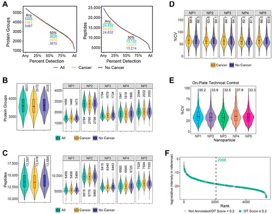 Proteomic characterization of subjects from serum prepared through ProteographTM. (A) The number of protein groups and peptides identified at a given detection percentage across all samples, including subjects with cancer and without cancer. Proteins and peptides identified for the entire study and at least 50% of subjects are indicated on the plot. Distribution of the number of protein groups (B) and peptides (C) identified for all subjects, including those with cancer and without cancer, from any number of NPs (left) or per NP (right). Inner boxplots show the 25, 50, and 75th percentile of data, with whiskers representing ±1.5 × interquartile range (IQR). Median protein groups or peptides are indicated above each plot. Violins encompass all observations. (D) Distribution of percent coefficient of variation (%CV) calculated from MaxLFQ values for each protein group per NP across cancer and no cancer subjects. Missing values are not included in the calculation. Boxplots display the same information as above except outliers, defined as equal to or beyond the IQR, which are not shown. Outer violins only capture data points up to the limits shown on the axis. (E) %CV for proteins enriched for the PC3 technical control across all batches of samples per NP. Parameters for the plot are the same as previously described. (F) Protein groups observed in any NP across all subjects are matched to plasma proteins characterized in Keshishian et al. [40] and their respective relative intensity and sorted rank based on published concentration. The median rank for these matched identifications is displayed by the vertical dashed line. Identified proteins matching those in the Open Targets database for prostate cancer with a globalScore of ≥0.2 are colored in green, while those with a globalScore < 0.2 or not matching any proteins in the list are in grey.
