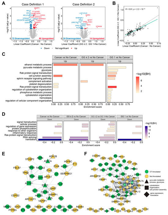 Differential protein expression for case definitions 1 and 2 and resulting functional enrichment analysis. (A) Volcano plots showing differential protein abundance from a linear mixed model for case definition 1 (left) and case definition 2 (right). Linear coefficients represent the log2 fold change in protein intensity between the respective indicated groups. (B) Scatterplot comparing the log2 fold change linear coefficients of protein groups with statistically significant (adjusted p-value < 0.05) differential abundance in case definition 1 vs. case definition 2. The dashed line in black, y = x, represents R = 1 correlation between the log2 fold changes in protein abundance and the solid line in teal is the resulting linear regression fit to the displayed data. The Pearson correlation coefficient, R, between these fold changes is displayed in the plot. (C) Upregulated and (D) downregulated processes according to 1D annotation enrichment analysis for different combinations of cancer and no cancer comparisons. (E) Interactome of the upregulated proteins and the downregulated proteins (F) for case definition 1. Edges represent interactions with a minimum STRING overall confidence score of 0.4.