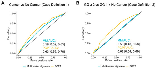 Classifier performance of the protein multimarker signature. ROC curves are shown for the protein-level data and the PCPT risk score in subjects with PSA 4–10 ng/mL for cancer vs. no cancer, defined here as case definition 1 (A) and GG ≥ 2 vs. both GG 1 and no cancer, case definition 2 (B). Average AUC for the protein signature and the PCPT risk score are displayed for each respective plot, with the 95% confidence interval indicated in brackets.
