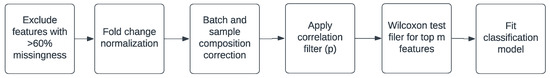 The steps in the custom pipeline are illustrated in Scheme 1. Initially, features with more than 60% missingness were excluded. Subsequently, the data were fold-change-normalized using the previously described method. Next, the fold-change-normalized log2 intensities were adjusted for batch effects and sample composition by fitting the linear mixed model