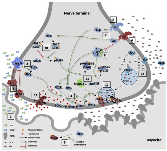 - Garcia, N.; Tomas, M.; Santafe, M.M.; Besalduch, N.; Lanuza, M.A.; Tomas, J. The Interaction between Tropomyosin-Related Kinase B Receptors and Presynaptic Muscarinic Receptors Modulates Transmitter Release in Adult Rodent Motor Nerve Terminals. J. Neurosci. 2010, 30, 16514–16522. [Google Scholar] [CrossRef]
