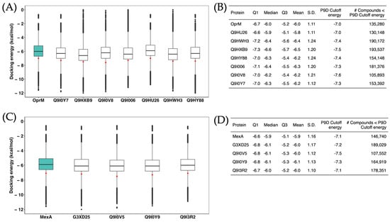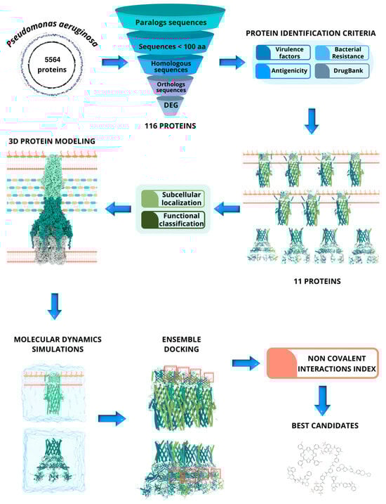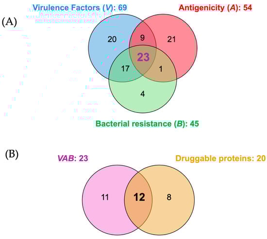 - Virulence Factors: We used the Virulence Factor Database (VFDB) [61] (http://www.mgc.ac.cn/VFs/, accessed on 10 January 2024) to identify proteins involved in virulence. Virulence factors are crucial for the pathogenicity of P. aeruginosa, making them ideal targets for drug development. We applied stringent criteria with a cutoff set at a bit score value greater than 100 and an e-value exceeding 10−5;
