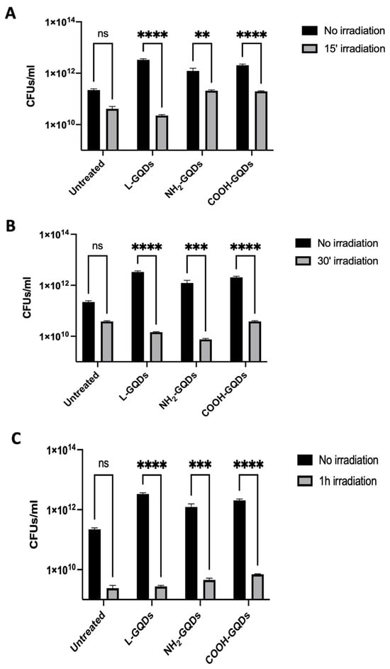 These data highlighted that GQDs’ antimicrobial activity against E. coli was directly dependent on their irradiation and slightly related to their functionalization.