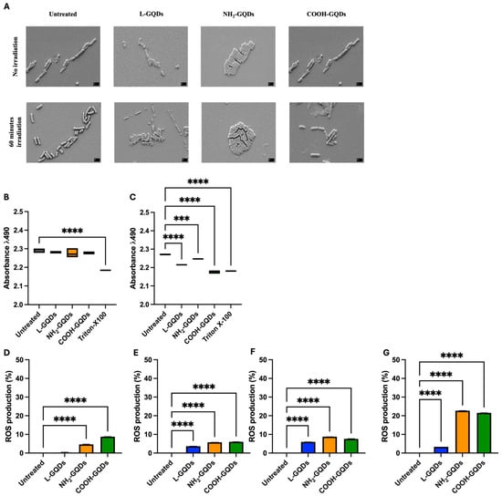 As previously mentioned GQDs induce reactive oxygen species, a property that appears shared from other carbon-based nanomaterials such as graphene oxide [,]. Additionally, GQDs, when exposed to blue light (470 nm), increased reactive oxygen species production, resulting in inducing cell death due to oxidative stress [,]. For this reason, we finally measured ROS production in E. coli culture treated with L-GQDs, NH2-GQDs, and COOH-GQDs, as previously described, and exposed to 470 nm wavelength light. ROS production appeared comparable between samples exposed or not to blue light in the first 60 min, when NH2-GQDs, and COOH-GQDs were administrated (Figure 3D,E). L-GQDs ROS stimulation was directly linked to light stimulation (Figure 3E). Interestingly, 4 h later, samples treated with NH2-GQDs, and COOH-GQDs and exposed to 470 nm blue light showed higher ROS production compared to control and L-GQDS or to counterparts not light exposed (Figure 3F,G). These results corroborated what observed with the MTS assay and demonstrated that GQDs’ antibacterial activity was light dependent and ROS mediated.