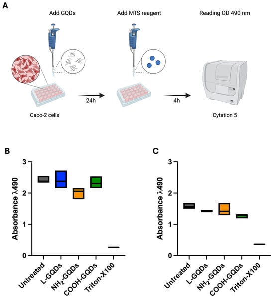 To evaluate the effects of GQDs on cell viability, Caco-2 cells (ATCC, Manassas, VA, USA; Accession Number: CVCL_0025) were cultured and subsequently seeded at a density of 5 × 105 cells per mL in 96-well plates (Corning, New York, NY, USA). The Caco-2 cells were incubated overnight under standard conditions (37 °C, 5% CO2) to ensure proper cell adherence and stabilization. Following this, the cells were treated with 200 µg/mL of three different GQD formulations (L-GQDs, NH2-GQDs, and COOH-GQDs) with or without exposure to blue light at a wavelength of 470 nm. Untreated cells were used as a negative control, while cells exposed to 2% Triton X-100 (Sigma-Aldrich) served as a positive control to induce maximum cytotoxicity. The MTS Cell Proliferation Assay (Abcam, UK) was then employed to assess the metabolic activity of the Caco-2 cells post treatment []. One hour after incubation with the GQDs, MTS reagent was added to each well and the plates were incubated for an additional 4 h at 37 °C. The absorbance was measured at 490 nm to quantify nanomaterials cytotoxicity.