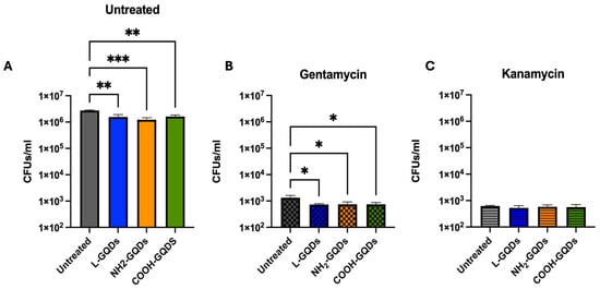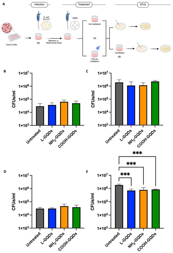 Caco-2 cells (ATCC, Manassas, VA, USA; Accession Number: CVCL_0025) were cultured in DMEM (Euroclone, Milano, Italy) supplemented with 20% inactivated FBS (Euroclone, Milano, Italy), 1% L-glutamine (Euroclone, Milano, Italy) and 1% streptomycin–penicillin (Euroclone, Milano, Italy) and were incubated at 37 °C and 5% CO2. Adherent cells were washed with sterile warm PBS (Euroclone, Milano, Italy) and removed for experiments by using 1× trypsin in PBS (Euroclone, Milano, Italy). Cells were counted and re-suspended in DMEM supplemented with 2% FBS and 1% L-glutamine. Finally, cells were seeded in sterile 48 well plates (Euroclone, Milano, Italy) at a concentration of 5 × 105 cells/mL and incubated overnight until infection or treatment. Caco-2 cells were infected with E. coli, with multiplicity of infection (MOI) of 100 (100 bacterium to 1 cell), resuspended in the cell culture medium. One hour post infection, infected cells were washed with sterile warm PBS to remove extracellular bacteria and treated with irradiated or non-irradiated GDQs for 1 h. Cells were incubated in standard atmosphere conditions for 24 h when CFUs were assessed by harvesting the cell monolayer with sterile 0.1 mL of sterile 0.05% Triton X-100 (Sigma-Aldrich). Serial dilutions in (1:10) of the cellular lysate were carried out before plating on LB agar plates. Plates were then incubated at 37 °C overnight (Figure 5A). CFUs/mL were obtained by multiplying the number of CFUs (colonies of E. coli) on agar plates by the appropriate dilution factor and reported as log CFUs/106 cells. To investigate the effects of GQDs on bacteria located outside cells as well as those within cells, the initial experiment was conducted again, incorporating an additional antibiotic treatment along with the nanomaterials. Gentamicin (Euroclone, Milano, Italy) and kanamycin (Sigma-Aldrich, USA) were administrated at minimal inhibitory concentrations (MICs), carrying out the experiment as described previously (Figure 6).