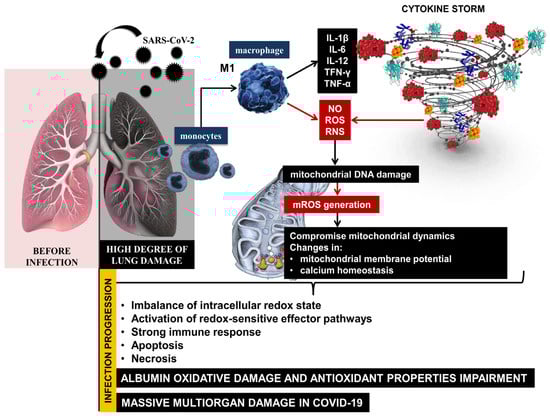 In severe COVID-19, IL-1 and IL-2 are the main interleukins involved in RNS production. The main reactive nitrogen species (RNS) that have been identified as mediators of redox reactions in patients with COVID-19 are nitric oxide (NO•), nitrogen dioxide radical (ONO•), and peroxynitrite radical (ONOO•). During the cytokine storm, the induced enzyme nitric oxide synthetase (NOs) stimulates the generation of nitric oxide. The NO formed reacts with the superoxide anion, resulting in the formation of the highly reactive peroxynitrite radical [58]. Peroxynitrite has a major role in tissue damage and inflammation in various diseases. It participates in inflammation by modulating the function of immune cells and the release of pro-inflammatory cytokines and chemokines [36]. The mechanism involves the parallel formation of large amounts of “inflammatory NO” and O2•−, which together form ONOO−, which initiates DNA damage, lipid oxidation, tyrosine nitration, and inhibition of mitochondrial respiration [59].