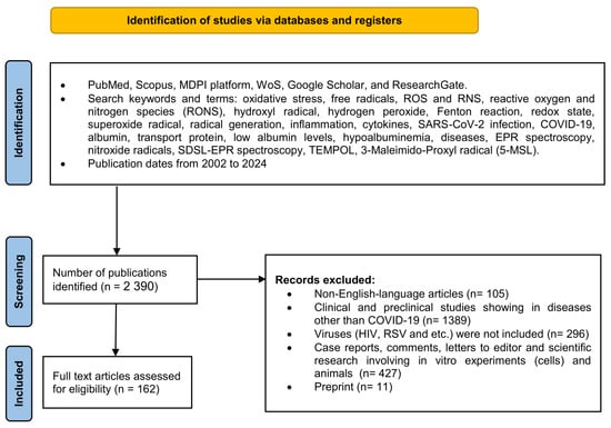 We used the databases PubMed, Scopus, MDPI platform, WoS, Google Scholar, and ResearchGate for the literature search, among which over 2390 scientific papers were identified and reviewed. The methodology, data extraction, and synthesis were adapted to the PRISMA-P [25] and PRISMA-S guidelines criteria [26]. This review employs a narrow-specialized scope of science to describe COVID-19-related hypoalbuminemia. First, it is aimed at hypoalbuminemia in SARS-CoV-2 infection, and second, at nitroxide radicals and EPR spectroscopy as a future diagnostic tool based on the assessment of total oxidative stress, ROS-induced qualitative changes in albumin, and quantitative changes in serum protein levels in COVID-19. The research strategy included data review and analysis of existing research and review articles in the timeframe from 2002 to 2024 (Figure 2).