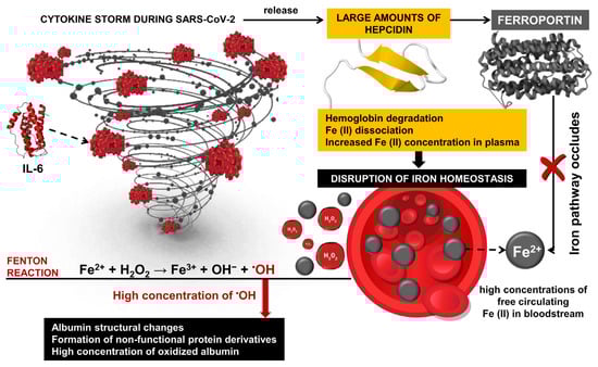 Oxidative stress is one of the major factors in the pathology of COVID-19 [109,110,111,112,113,114,115] and post-COVID-19 syndrome [116,117]. It is associated with extensive structural changes in multiple proteins, including albumin, suggesting the proliferation of malfunctioning derivatives of this critical protein. Induced structural and functional changes in albumin are accompanied by hypoalbuminemia [118] and can be a serious prerequisite for ineffective therapy with frequent complications and high mortality in patients with SARS-CoV-2 [119,120]. Overproduction and abnormal concentrations of free radicals, together with ineffective antioxidant defenses of the body, can be seen as leading factors in severe COVID-19 [121,122]. Under conditions of OS, proteins undergo various modifications, including disruption of their function and compromise of their biological activity. As a result, malfunctioning protein derivatives proliferate in the body [18,123]. Hyperactivation of innate immunity and overproduction of ROS are thought to be major contributors to the massive multiorgan damage caused by the SARS-CoV-2 infection [32]. High levels of pro-inflammatory cytokines, especially IL-6, initiate the release of large amounts of hepcidin during the cytokine storm, leading to the disruption of iron homeostasis through hemoglobin degradation and Fe ions dissociation [124]. It is known that hydrogen peroxide and neutrophil-mediated OS are basic factors of structural changes in HSA in critically ill COVID-19 patients [34]. At the basis of this mechanism are high concentrations of free circulating iron in the bloodstream, and together with H2O2, participates in Fenton reactions with the formation of highly reactive hydroxyl radicals [125,126,127] (Figure 3).