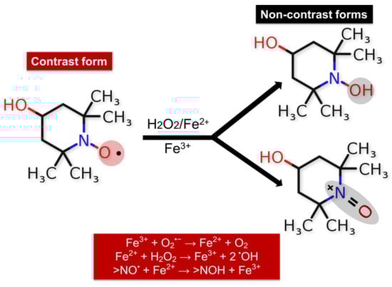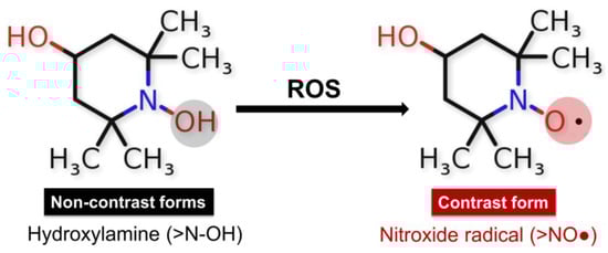 - Nyui, M.; Nakanishi, I.; Anzai, K.; Ozawa, T.; Matsumoto, K.I. Reactivity of redox sensitive paramagnetic nitroxyl contrast agents with reactive oxygen species. J. Clin. Biochem. Nutr. 2019, 64, 13–19. [Google Scholar] [CrossRef] [PubMed]