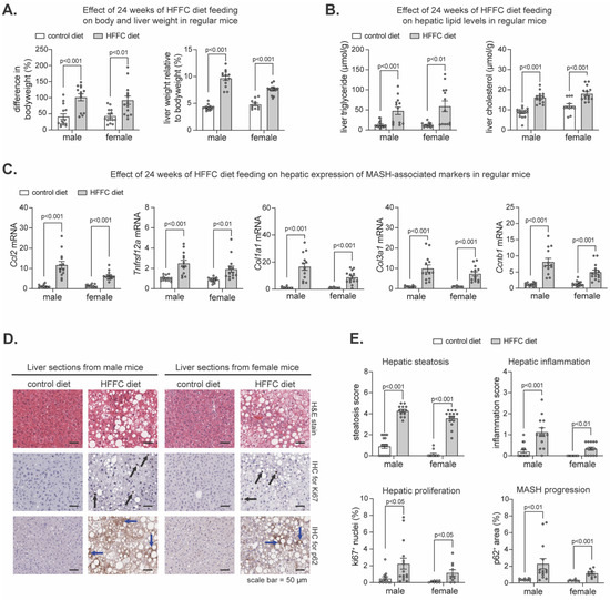 To determine the extent to which the flox lines were prone to developing diet-induced MASH, we pooled them and compared MASH-related parameters in AAV-GFP-infected mice fed an HFFC diet to AAV-GFP-infected mice fed a control diet. As expected, chronic HFFC diet increased the body weight and liver-to-body weight ratio in males and females (Figure 1A), coinciding with increased hepatic triglyceride and cholesterol (Figure 1B). Likewise, transcriptional analyses of livers using quantitative polymerase chain reaction (qPCR) revealed HFFC diet intake increased expression of MASH markers involved in liver inflammation (Ccl2, Tnfrsf12a), fibrogenesis (Col1a1, Col3a1) and cell proliferation (Ccnb1) (Figure 1C). To further elucidate the effect of HFFC diet on MASH development, histological examination of liver sections was performed (Figure 1D,E). We used hematoxylin and eosin (H&E) staining to assess steatosis and inflammation, immunohistochemical (IHC) staining of Ki-67 to assess hepatocyte proliferation [62], and IHC staining of p62 as a marker of liver damage, chronic steatohepatitis, and risk for hepatocellular carcinoma (HCC) onset and progression [34,35,63,64]. Compared to control, HFFC diet increased hepatic steatosis and inflammation as well as proliferation and p62 accumulation (Figure 1D,E). Thus, consistent with others [55], chronic HFFC diet intake induced MASH within a 24-week time frame, confirming that using this diet on these mouse lines is suitable for investigating the role of Nrf1 and Nrf2 in the progression of MASH to cirrhosis and HCC.