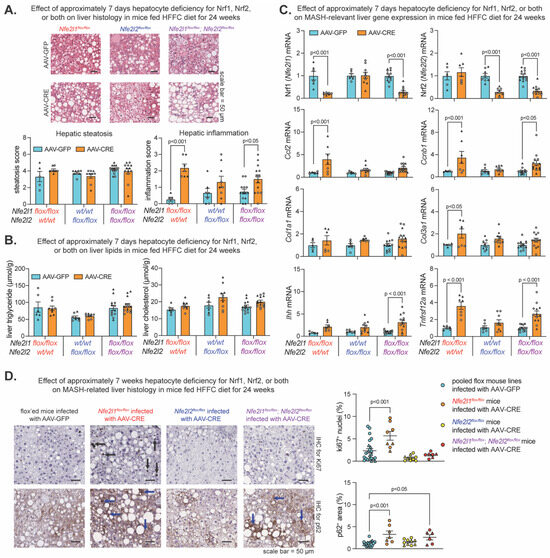 We have shown short-term (i.e., 10–21 days) hepatocyte Nrf1 and Nrf2 deficiency, but not single gene deficiency, results in hepatic lipid accumulation, oxidative damage, and inflammation in mice fed an HFFC diet for only 17–28 days [20]. However, the effect on lipid levels did not occur in short-term gene-deficient mice that already had chronic HFFC diet-induced MASH, while other aspects related to liver inflammation did still occur. Here, we investigated the impact of hepatocyte Nrf1, Nrf2, or combined deficiency for ~7 days or for ~7 weeks on MASH progression. Using the long-term diet experimental model described above and, in this case, pooling male and female samples of each flox line, we compared MASH-related parameters in AAV-CRE-infected mice fed an HFFC diet to AAV-GFP-infected mice fed an HFFC diet (Figure 2), as well as the AAV-CRE-infected mice fed a control diet to AAV-GFP-infected mice fed a control diet (Figure S1).