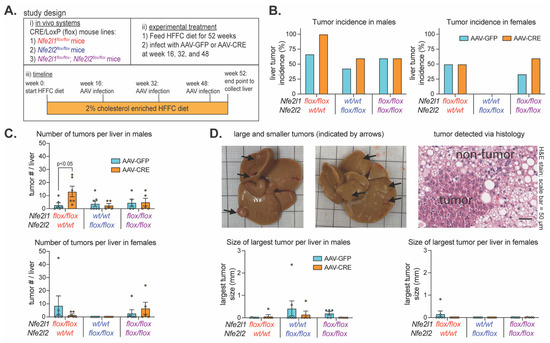 Effect of hepatocyte deficiency for Nrf1, Nrf2, or both on liver tumor development. (A) Study design showing that mice were fed HFFC diet with 2% cholesterol for 52 weeks and infected on weeks 16, 32, and 48 with indicated virus. Liver tumor analysis was performed at the endpoint. (B,C) % incidence of liver tumors (B) and the number of tumors per liver (C) in males (n = 5–7) and females (n = 5–6). (D) Volume of largest liver tumor in males (n = 5–7) and females (n = 5–6) and representative tumor images (black arrows indicate tumors). Data are mean ± standard error of the mean, with individual data points shown. The p-value was determined by two-way analysis of variance, with Sidak post-test.