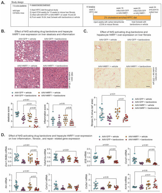Previously [20], we showed both Nrf1 and Nrf2 were required for beneficial effects of 2-week treatment with the Nrf2-activating drug bardoxolone on MASH in 24-week HFFC diet-fed mice, and combining 1-week bardoxolone treatment with hepatocyte overexpression of human NRF1 (hNRF1) exhibited a partial synergistic effect in mice fed an HFFC diet for 16 weeks. Using similar methods to induce Nrf1 and Nrf2, here we investigated whether more prolonged induction of Nrf1, Nrf2, or both may alleviate MASH and fibrosis in a MASH-linked fibrosis model. As illustrated in Figure 4A, male and female C57bl/6J mice were fed a 2% cholesterol-enriched HFFC diet for 24 weeks. To induce liver fibrosis, mice were injected with the hepatocyte-damaging agent carbon tetrachloride [65,66,67,68] once per week for the first 15 weeks. At week 16 and 20, mice were infected with AAV-hNRF1 to induce and maintain increased hepatocyte Nrf1 activity or with AAV-GFP, as a control. Also, from week 16 to 24, mice were injected three times per week with bardoxolone or vehicle control. At week 24, liver was collected for analysis of the four groups: AAV-GFP + vehicle, AAV-GFP + bardoxolone, AAV-hNRF1 + vehicle, and AAV-hNRF1 + bardoxolone.