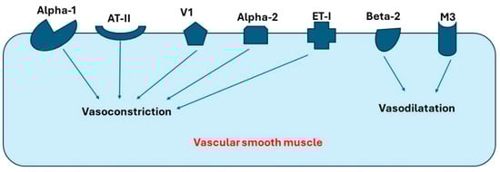 Many receptors expressed in blood vessels can affect blood pressure, preload, and afterload through vasoconstriction or vasodilatation. Those receptors include alpha-1, alpha-2, beta-2, muscarinic receptor-3 (M-3), vasopressin-1a (V1a), endothelin-1 (ET1), and angiotensin-II (AT-II). Moreover, V1a and ET-1 have been found to be the most common receptors in both coronary arteries and pulmonary artery, while beta receptors have the lowest expression levels in these arteries [11,12,13,14]. Interestingly, alpha-2 receptors have higher expression in the coronary artery compared to other arteries. As a result, Liu et al. suggest that agents blocking alpha-2 receptors can present a novel therapy for ischemic cardiomyopathy [12]. In summary, receptors expressed in arterial blood vessels can be classified into the following: (1) receptors causing vasoconstriction, such as alpha-1, alpha-2, AT-II, and V-I, and (2) receptors causing vasodilation, such as M3 and beta-2. Figure 1 demonstrates the important receptors expressed in the blood vessels and their primary function.