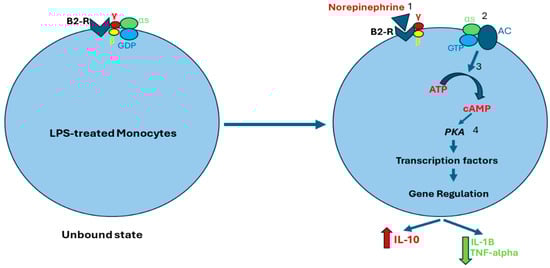 Beta-2 receptors are coupled to G protein alpha s-subunit (Gαs). Norepinephrine binds to beta-2 receptors, leading to guanosine diphosphate (GDP) exchange with guanosine triphosphate (GTP), and Gαs and G protein beta/gamma subunit (Gβγ) uncoupling. The GTP–Gαs complex activates adenyl cyclase (AC) which stimulates adenosine triphosphate (ATP) conversion to cyclic adenosine monophosphate (cAMP), which then activates protein kinase A (PKA). Subsequently, PKA regulates gene transcription, resulting in enhanced production of anti-inflammatory cytokines, such as IL-10, and inhibiting the production of pro-inflammatory factors, such as IL-1B and TNF-alpha (Figure 2) [16,52,53,54].