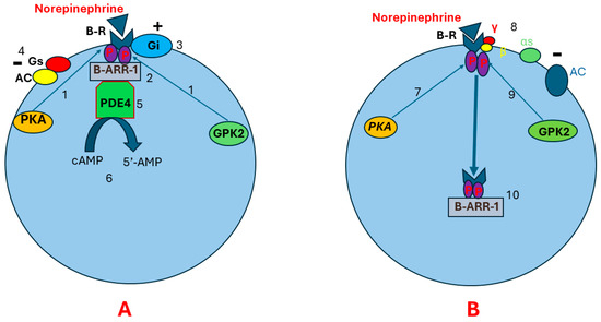 Continuous stimulation of beta receptors by catecholamines may lead to receptor desensitization and downregulation. Receptor desensitization happens through phosphorylation of beta receptors by PKA, leading to Gαs and Gβγ uncoupling. This allows G protein-coupled kinase-2 (GPK2) to bind to Gβγ. Beta receptor phosphorylation at two different sites by GPK2 and PKA results in conformational changes in beta receptors that allow a scaffolding protein called B-arrestin-1 to bind to the beta receptors. The B-arrestin plus Beta receptor complex leads to conformational changes in beta receptors [61,62,63,64,65,66]. This may result in three consequences. First, the new conformational changes enhance beta receptor coupling to Gi protein and impair Gs binding to the beta receptors. This suppresses AC activity and prevents cAMP production [67,68]. Second, the beta receptor plus B-arrestin complex recruits cyclic nucleotide phosphodiesterase (cnPDE) to attach to this complex, leading to the hydrolyzation of cAMP to 5’-adenosine monophosphate (5’-AMP). This results in degradation of the pre-existing cAMP [69,70,71]. Third, B-arrestin induces beta receptor internalization. The internalized receptors are transported to lysosomes for degradation (Figure 3) [72,73,74,75].