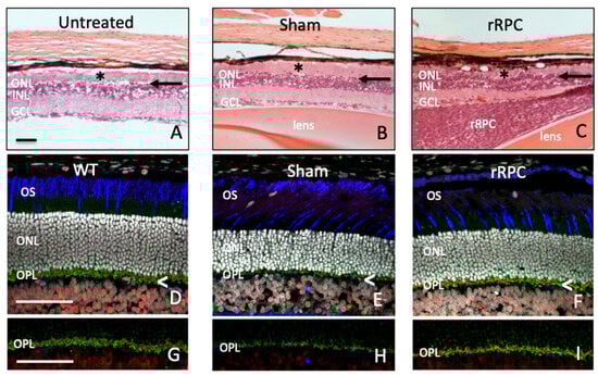 Figure 1H). Subsequent histological analysis revealed significant partial rescue of the outer nuclear layer (ONL) of approximately four rows of photoreceptor nuclei in RPC-treated eyes (