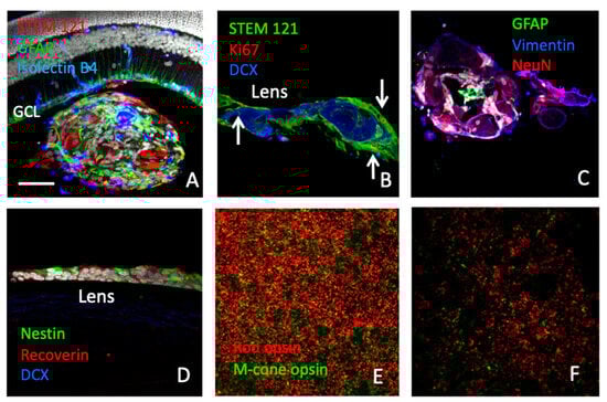Figure 5B,D). Cells within the grafts expressed the retinal progenitor-associated markers nestin, vimentin, and Ki-67, or neuronal or glial lineage markers such as DCX, NeuN, recoverin, or GFAP, indicative of ongoing differentiation (