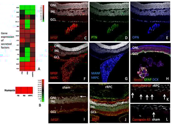 Figure 7B). Following transplantation to the eye, hRPCs maintained expression of factors, including bFGF, PTN, OPN, and MANF, as demonstrated by IHC (