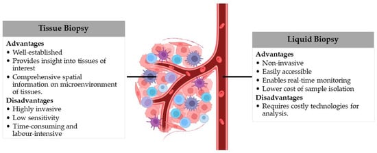 The recent era has witnessed an explosion of interest in the use of accessible body fluids to identify and track disease. As an alternative to biopsy of solid tissue/organ, liquid biopsy involves sampling body fluids, usually for molecular components or cells released from the tissue/organ of interest [10]. Such body fluids include blood, plasma or serum, urine, saliva, cerebrospinal fluid and others (e.g., pleural effusion) [11,12]. Compared to tissue/organ biopsy, the liquid biopsy approach is advantageous because it is less invasive and less expensive, and it offers the convenience of serial biopsies for monitoring disease progression (Figure 3) [13,14,15,16,17]. Liquid biopsies can sample numerous molecular entities in the blood, including circulating tumour cells, circulating endothelial cells (CEC), circulating nucleic acids, such as cell-free nuclear DNA (cfDNA), cell-free mitochondrial DNA, circulating tumour DNA and cell-free RNA, as well as extracellular vesicles (often containing nucleic acid components).